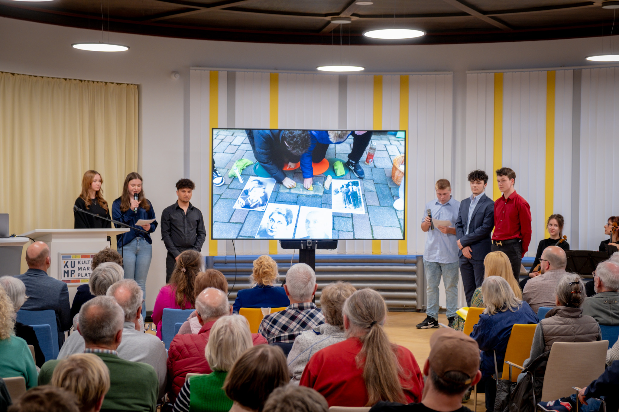 Der Verein Spurensuche Harzregion hatte die Veranstaltung organisiert: Dr. Kurt Fontheim führte in die Thematik ein und Dr. Stefan Cramer stellte die Recherchen zu Goslarer „Euthanasie“-Opfern vor. Sabine Rehse stellte das Konzept der Ausstellung vor. 14 Schüler*innen der AG „Goslar im Nationalsozialismus“ (JG 10) präsentierten zunächst eindrucksvoll ihre Projektarbeit und stellten später im Ausstellungsraum den etwa 120 Gästen ihre eigens erstellten Exponate vor.