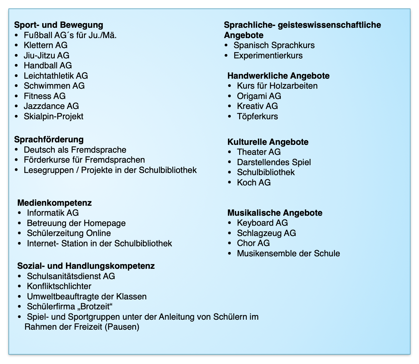 Wie im unterrichtlichen Spektrum der verschiedenen Lern- und Kompetenzbereiche sollten auch bei den außerunterrichtlichen Angeboten verschiedenen Erfahrungs- und Lernbereiche angeboten werden, um die individuellen Förder- und Förderung des Einzelne zu unterstützen.