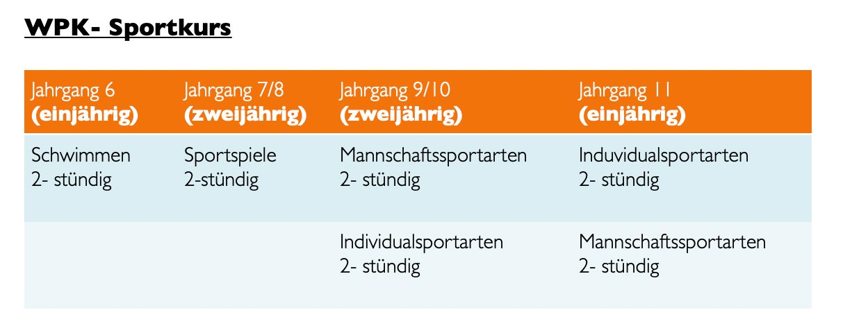 Der Regelunterricht wird zusätzlich durch ein Wahlpflichtangebot (WPK- Kurse) für die Jahrgänge 6, 7/8 und 9/10 ergänzt. In der 11. Klasse gibt ebenfalls die Möglichkeit einen Sportkurs zu wählen. Dieses Sportkursangebot wird, in Zusammenarbeit mit dem Sportkollegen, jedes Jahr evaluiert und entsprechend den Lehrer- und Schülermöglichkeiten angepasst.