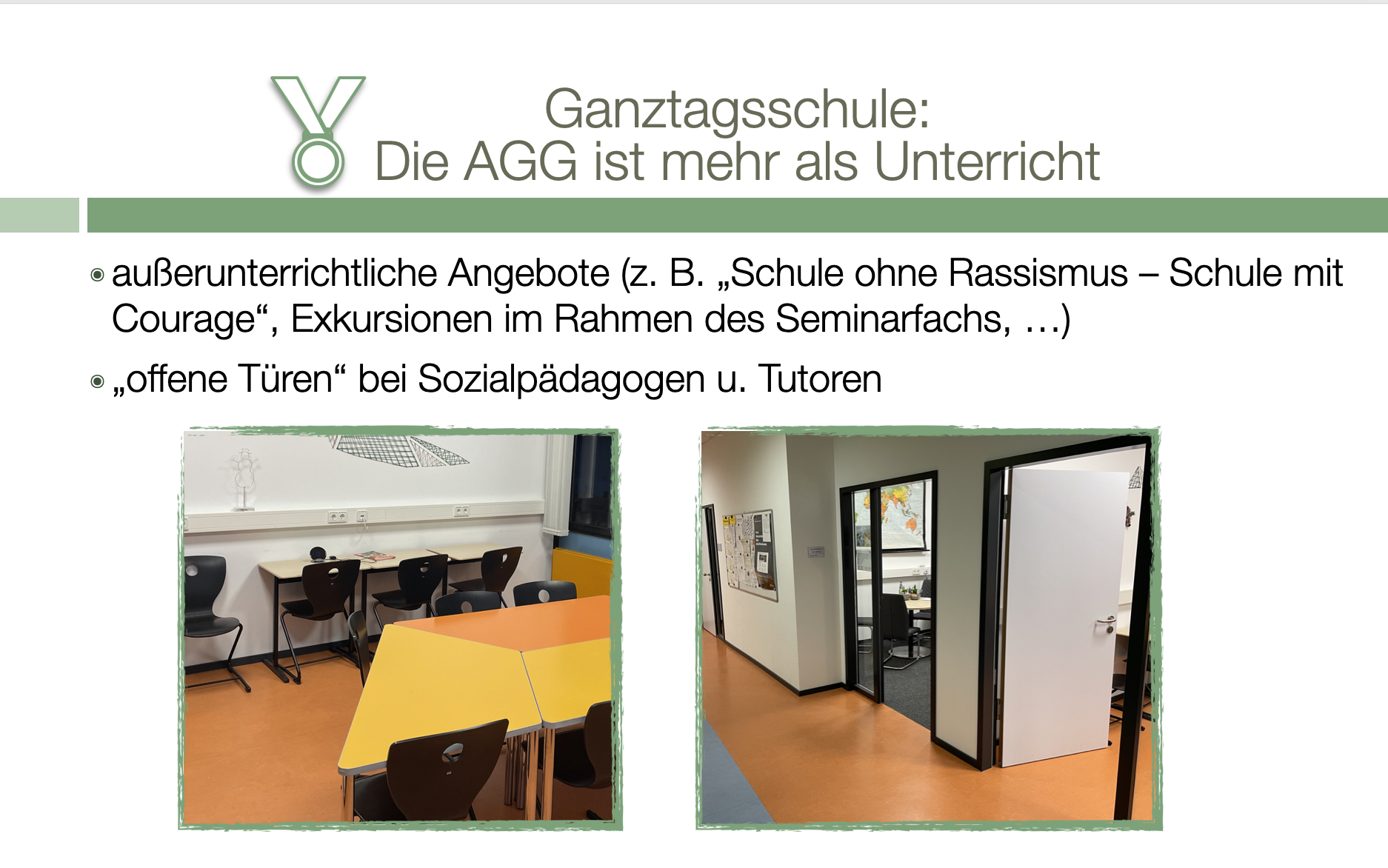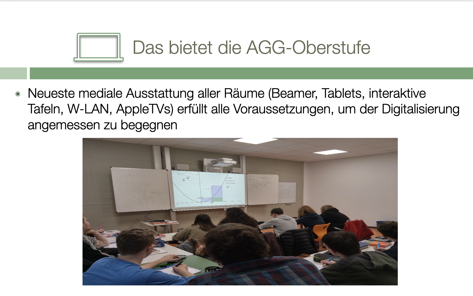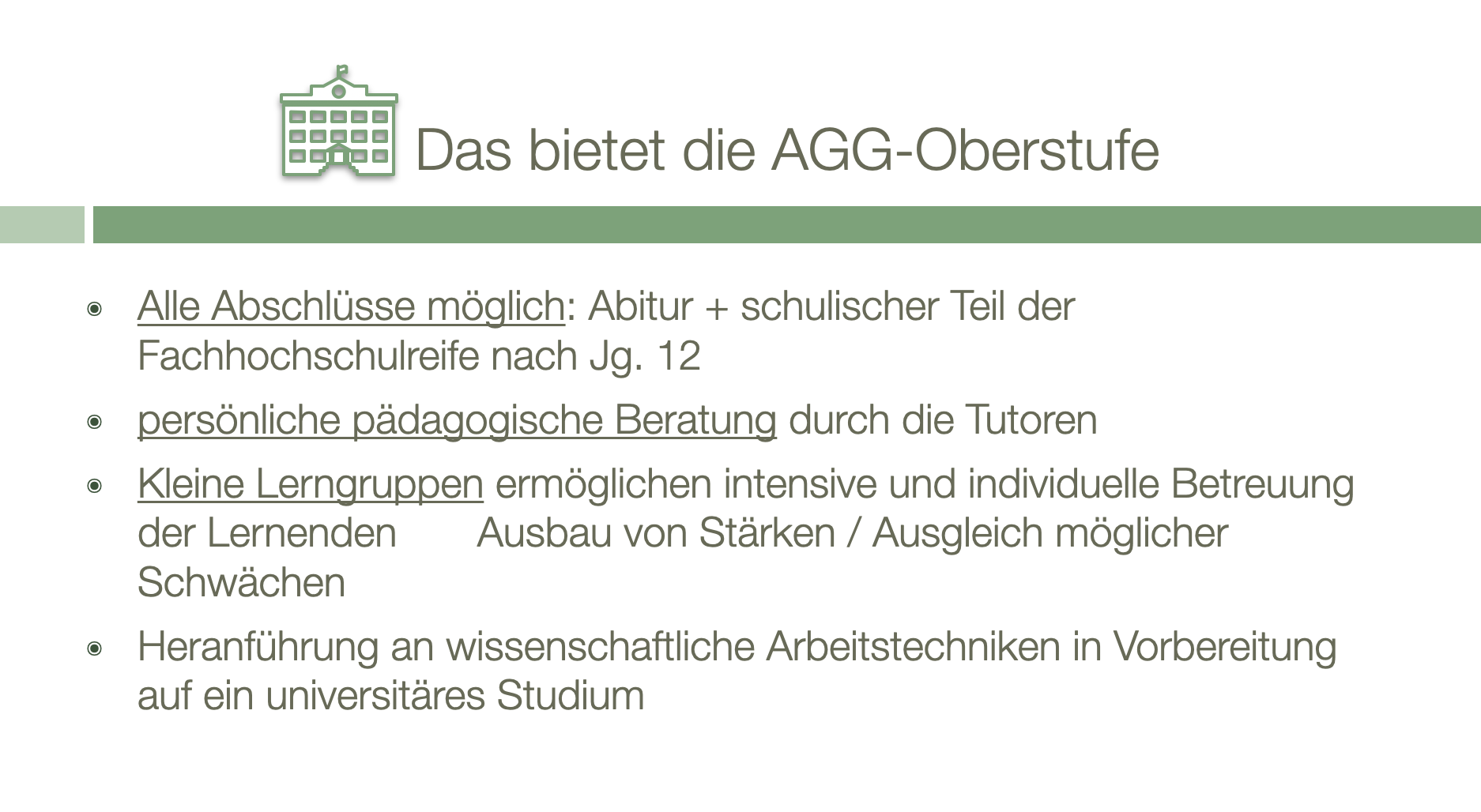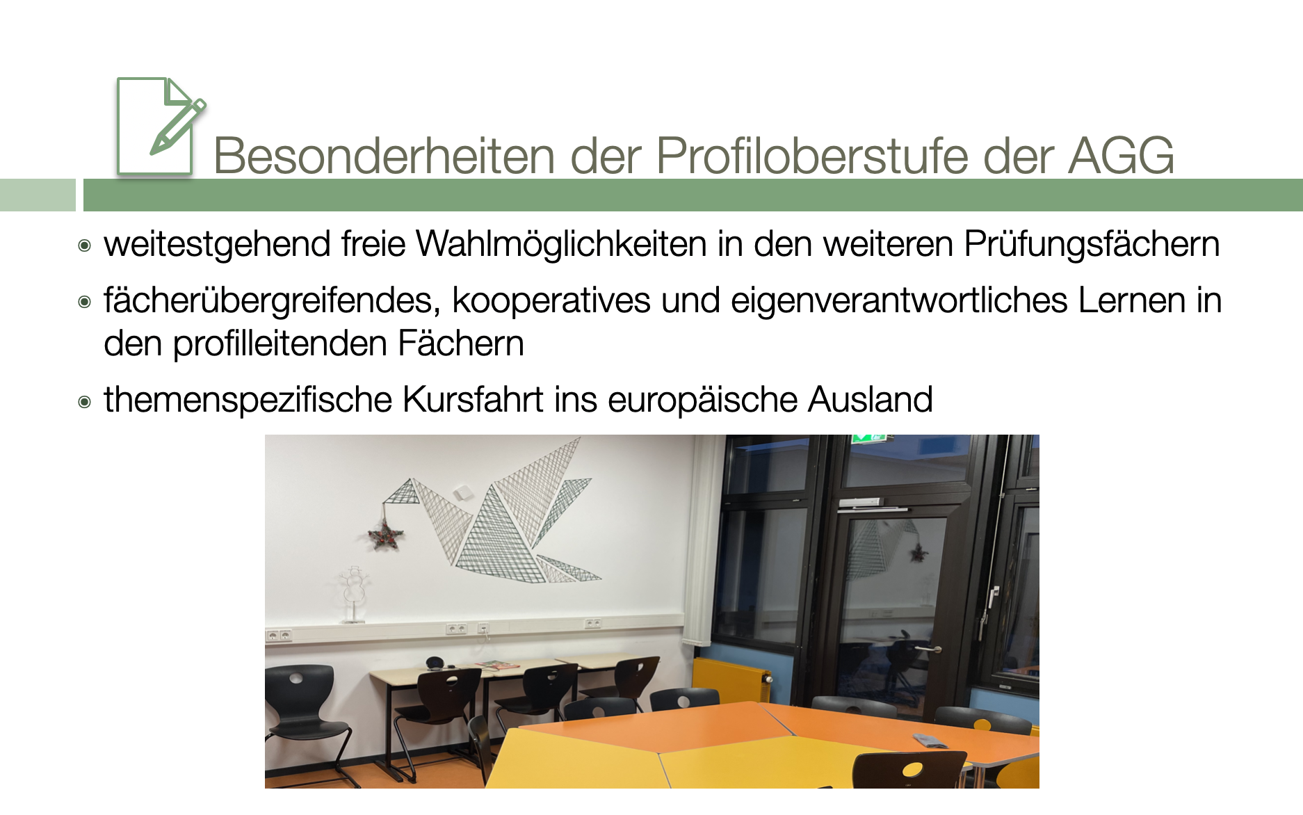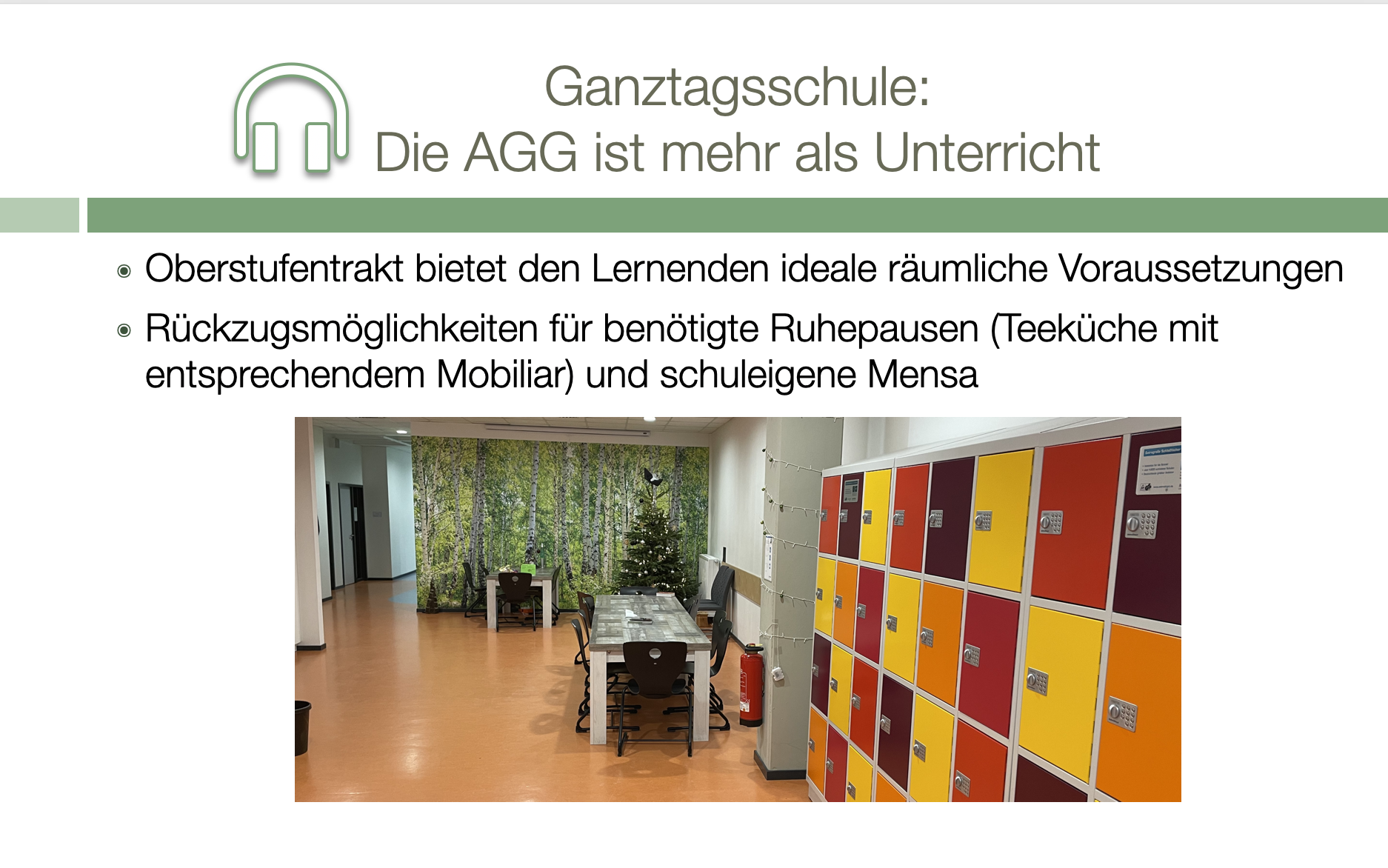 Generell sehen wir an der gesamten AGG die Schule nicht nur als einen Ort zum Lernen an. Schule ist für uns mehr – ein Lebensraum, ein Ort, an dem die Schülerinnen und Schüler teilweise mehr Zeit verbringen als ihre Eltern am Arbeitsplatz. Deshalb legen wir großen Wert darauf, dass unsere Schülerinnen und Schüler einen Ort zur Verfügung haben, an dem sie nicht nur bestmöglich lernen können, sondern der es ihnen erlaubt, sich in ihrer Vielfalt auszuleben und wohlzufühlen. Hierfür ist es uns sehr wichtig, dass alle unseren Oberstufenbereich mitgestalten und ihre Ideen einbringen können.