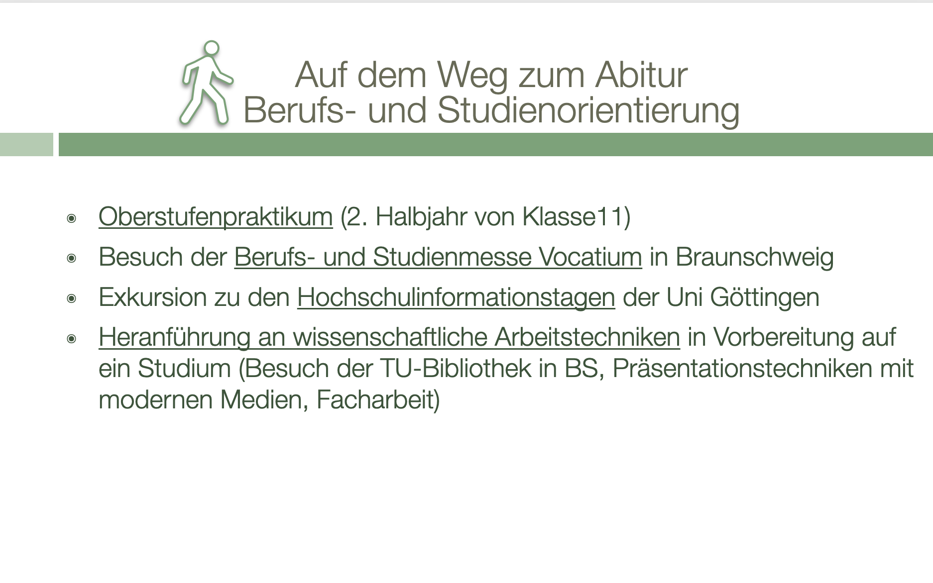 Diese kleinen Gruppen führen aber auch dazu, dass wir nicht immer alle Wahlmöglichkeiten vorhalten können, die seitens des Kultusministeriums theoretisch möglich sind. Aber hier finden wir in vielen persönlichen Gesprächen Lösungen in unserem System der Profiloberstufe, ggf. auch in Kooperation mit anderen Goslarer Oberstufen.