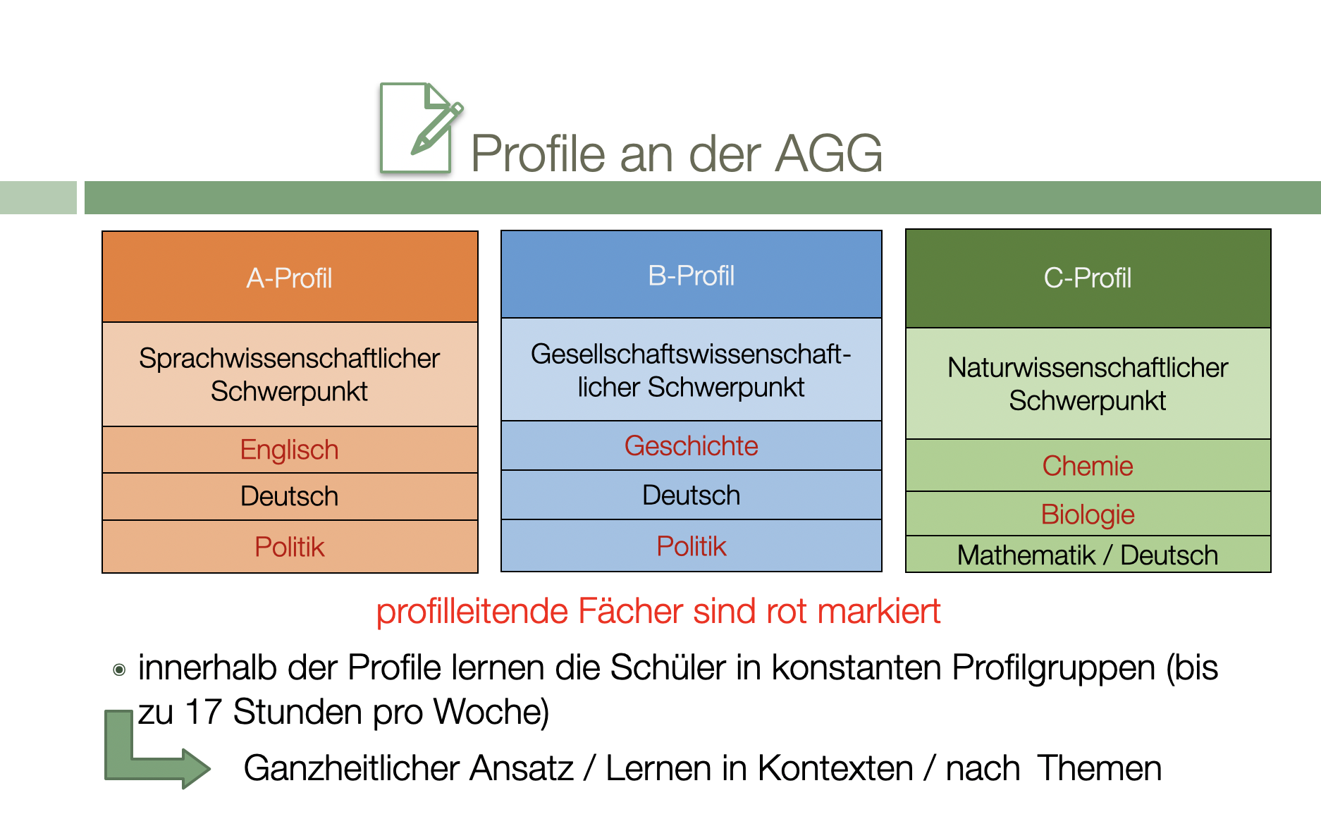 Unser Ziel ist es, innerhalb der Profile in den profilleitenden Fächern fächerübergreifendes, kooperatives und eigenverantwortliches Lernen zu ermöglichen. Dies versuchen wir in einer Kombination aus festen Profilgruppen (profilleitende Fächer, Leistungskurse) und individuellen Wahlmöglichkeiten (Fächer auf grundlegendem Niveau) zu ermöglichen.