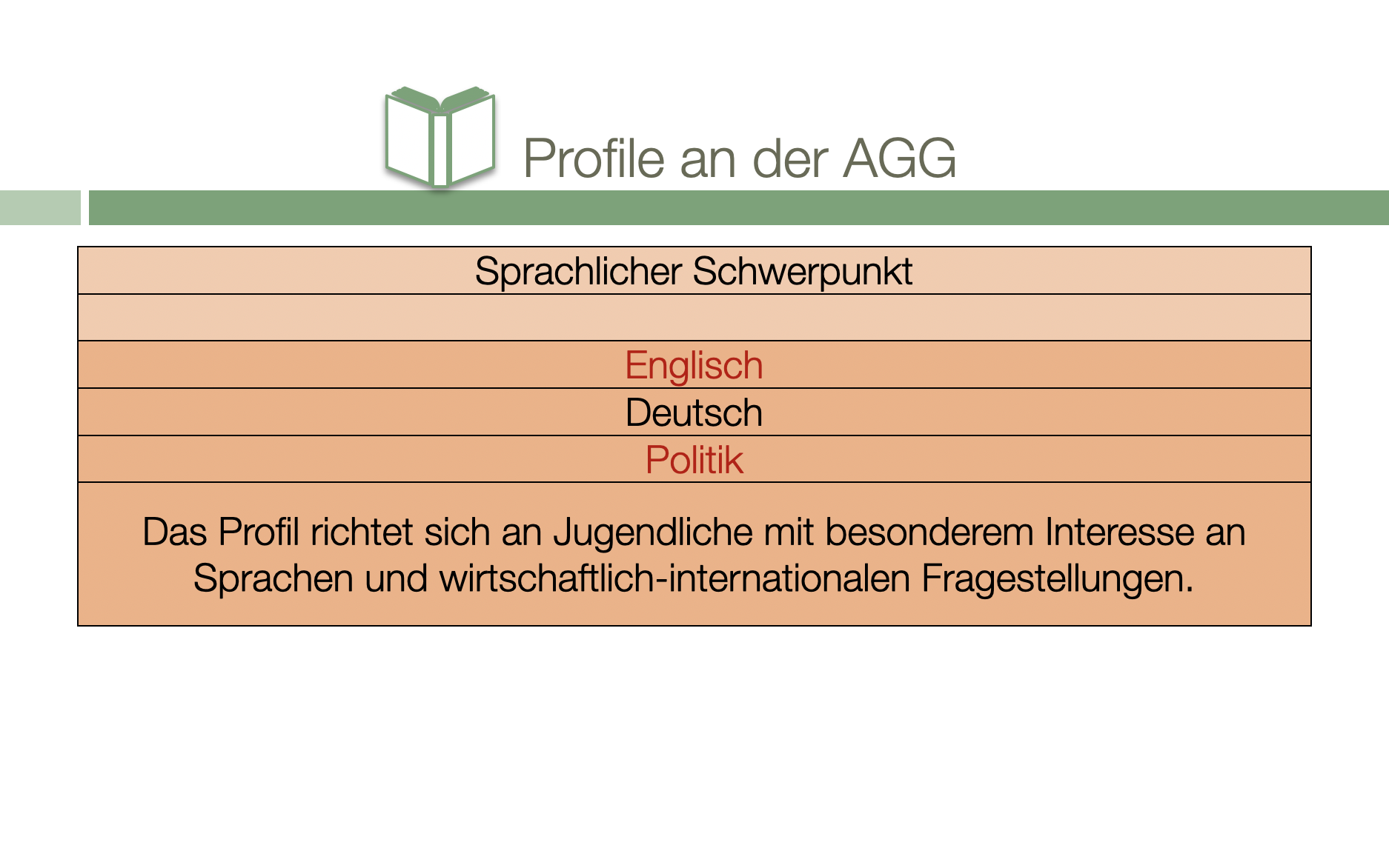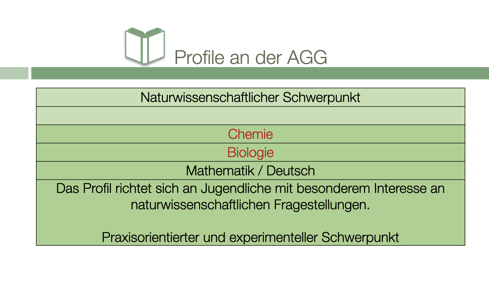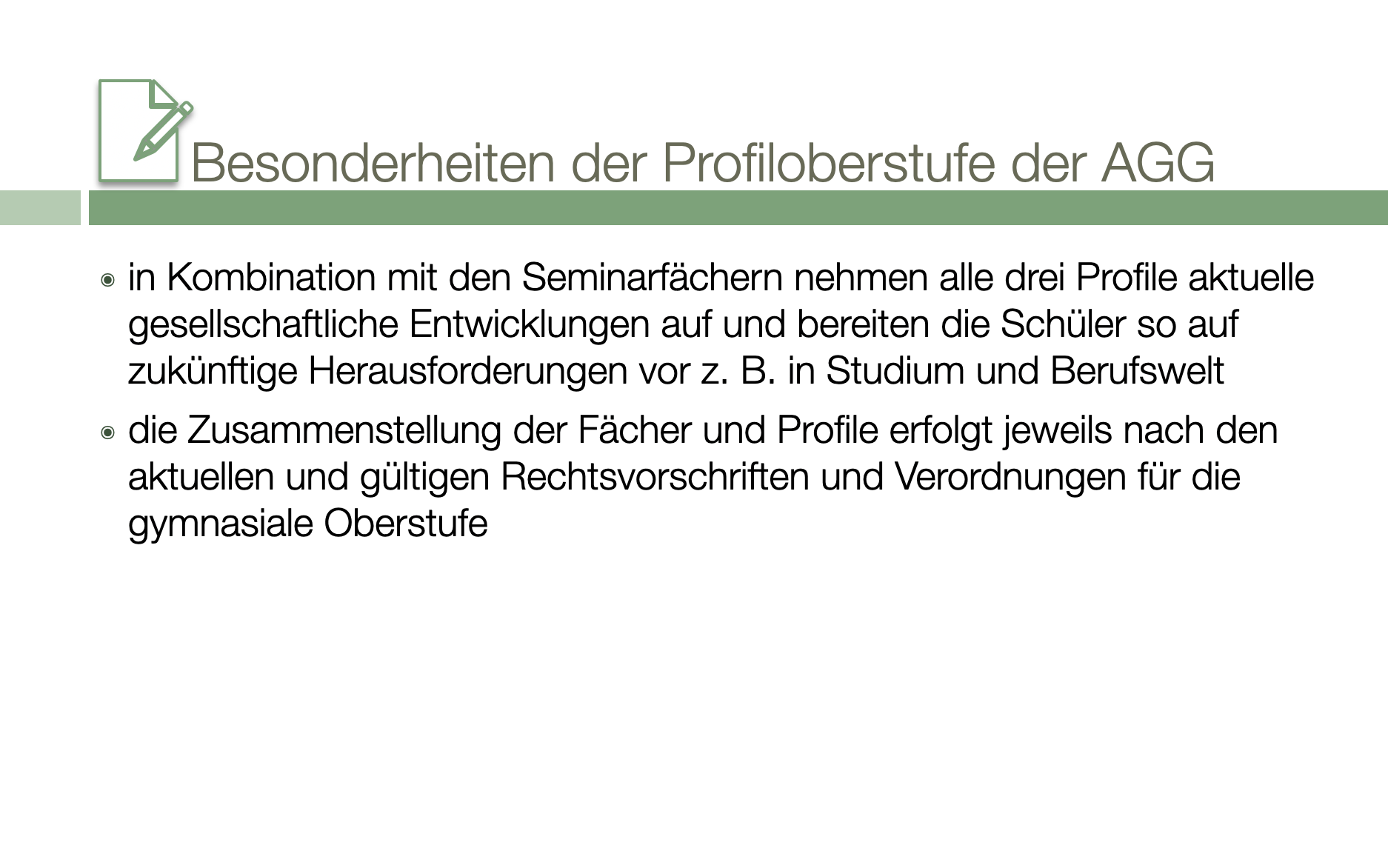 In Kombination mit den Themen der Seminarfächer nehmen unsere drei Profile aktuelle gesellschaftliche Entwicklungen auf und bereiten die Schüler so auf die zukünftigen Herausforderungen z. B. in Studium und Berufswelt vor.