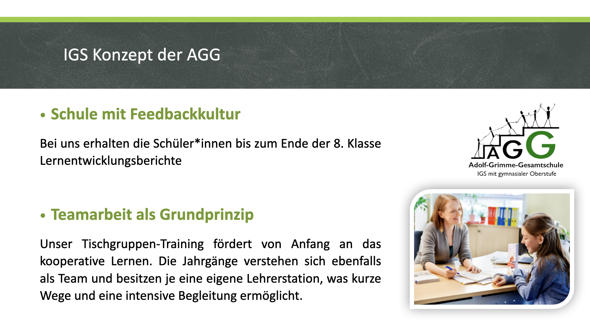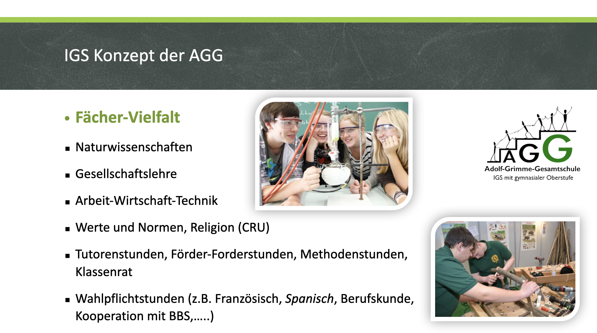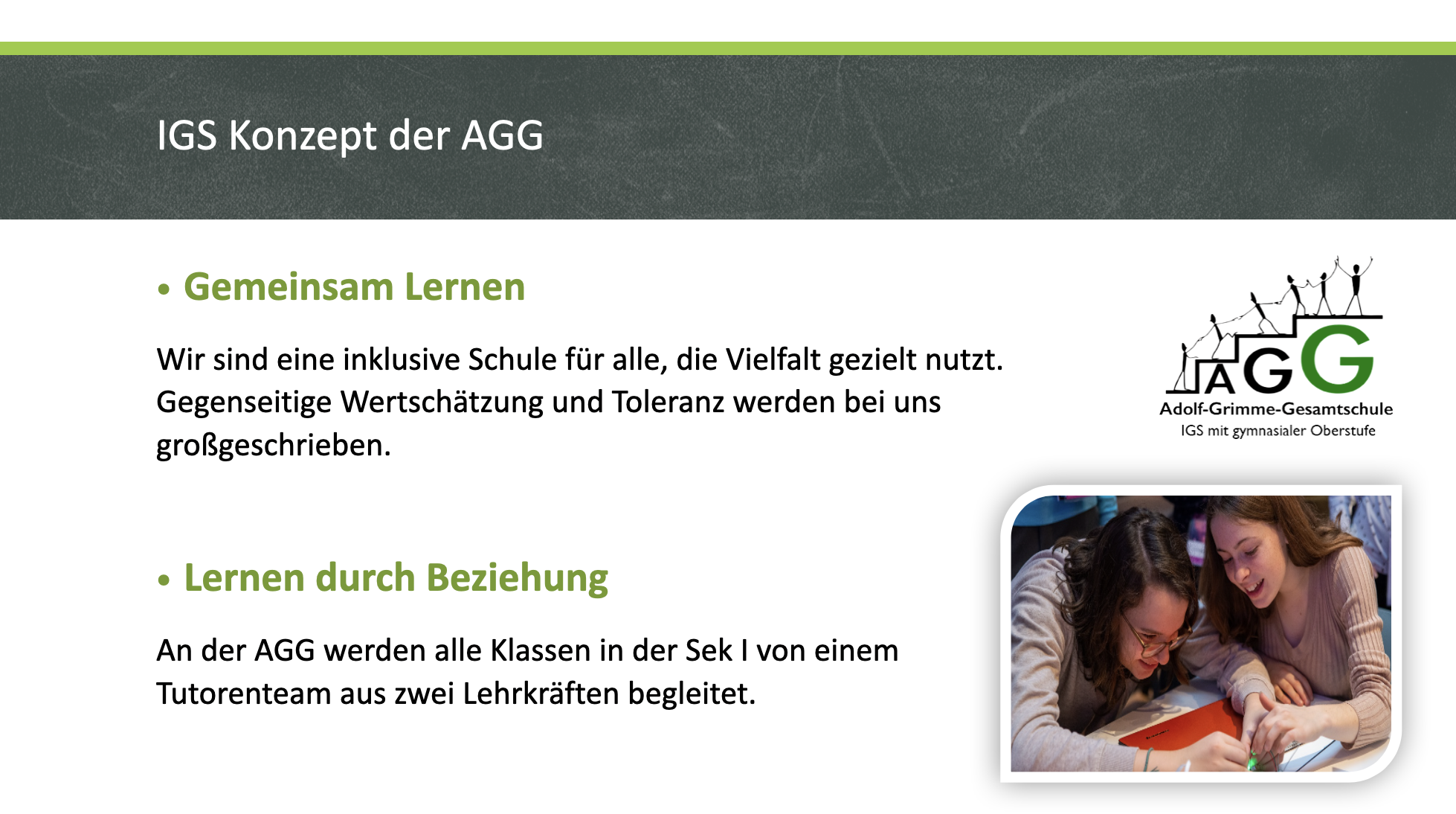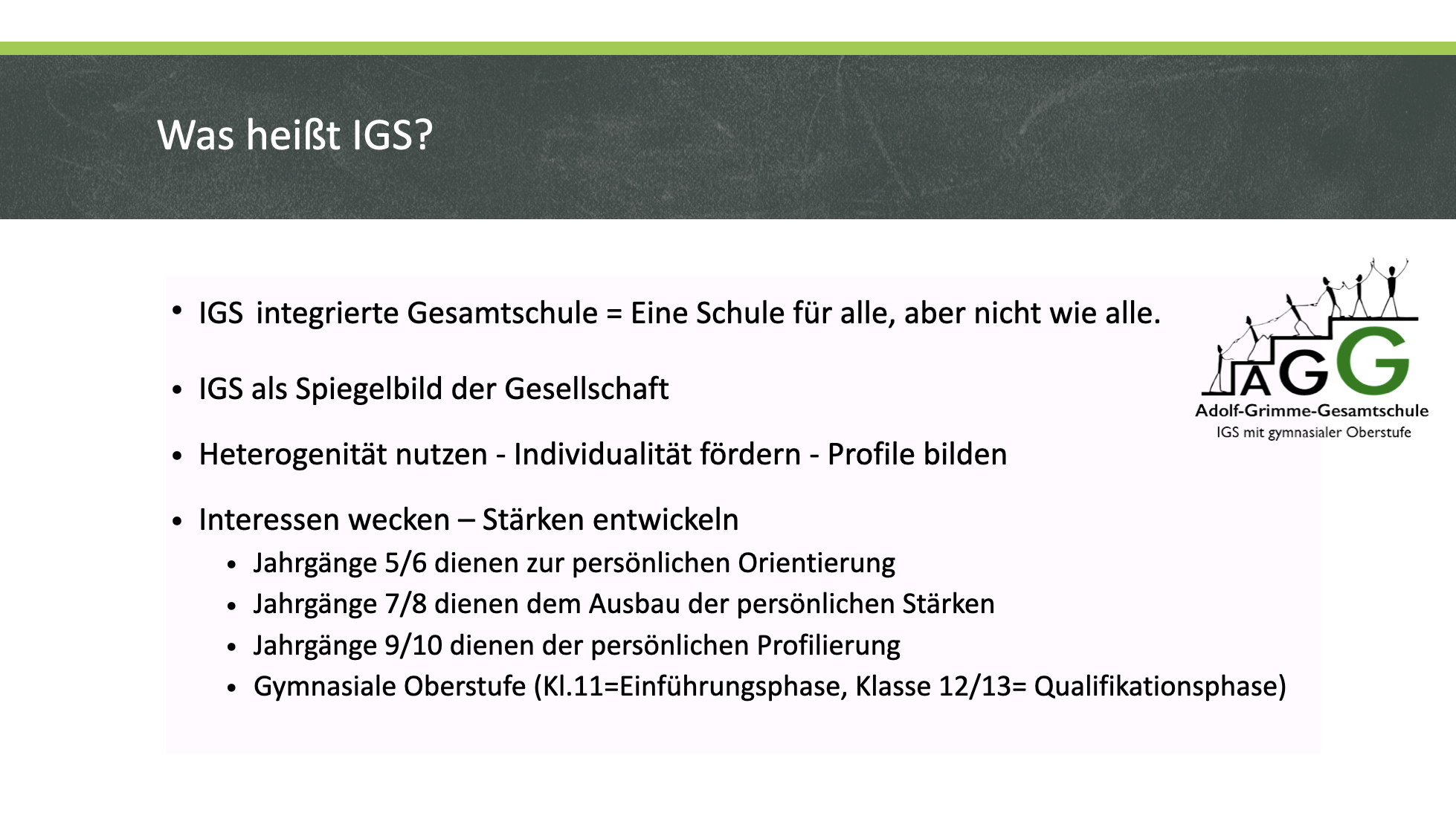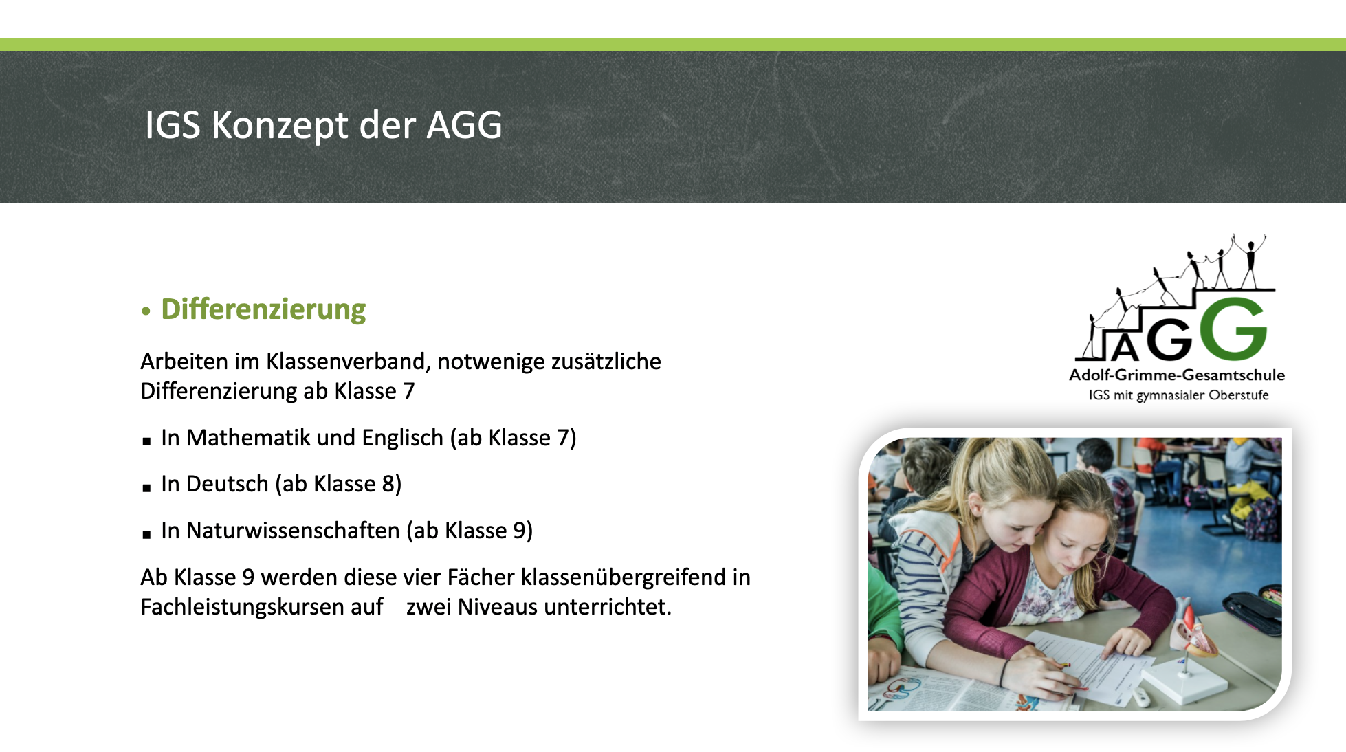 An der Adolf-Grimme-Gesamtschule werden alle Schülerinnen und Schüler (ich bin mir nicht mehr sicher, auf welches Format wir uns geeeinigt haben) in der Sekundarstufe I von Klasse 5 bis 10 gemeinsam im Klassenverband unterrichtet. Dort spielt die innere Differenzierung auch mit Lehrertandems eine besondere Rolle. Jede Schülerin und jeder Schüler wird auf seinem Niveau gefördert und gefordert. Ab Klasse 7 kommen Wahlpflichtkurse hinzu.