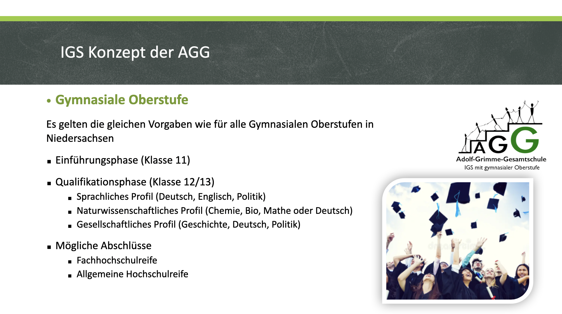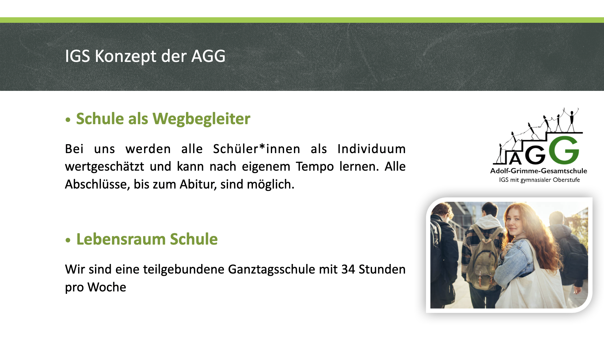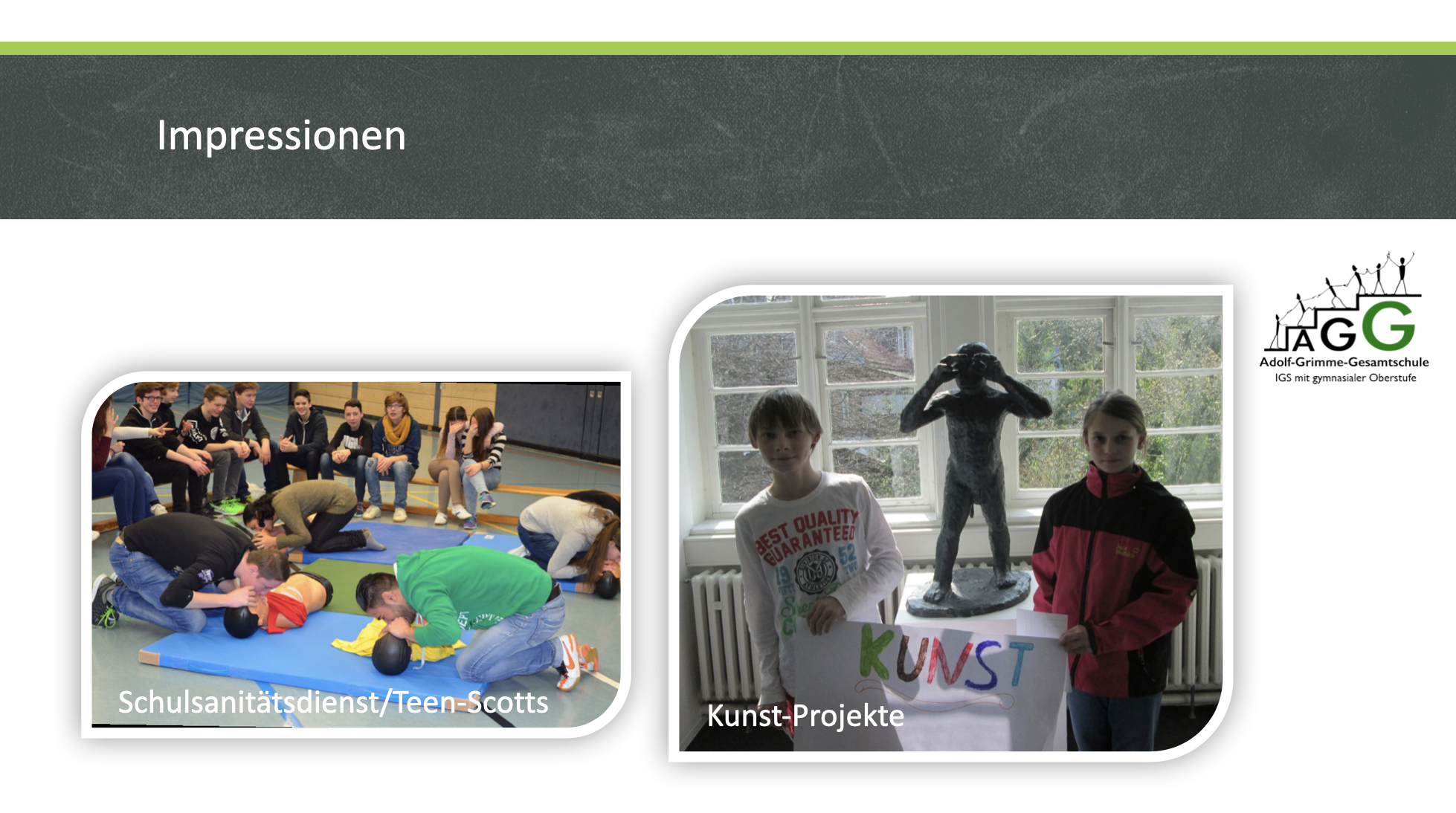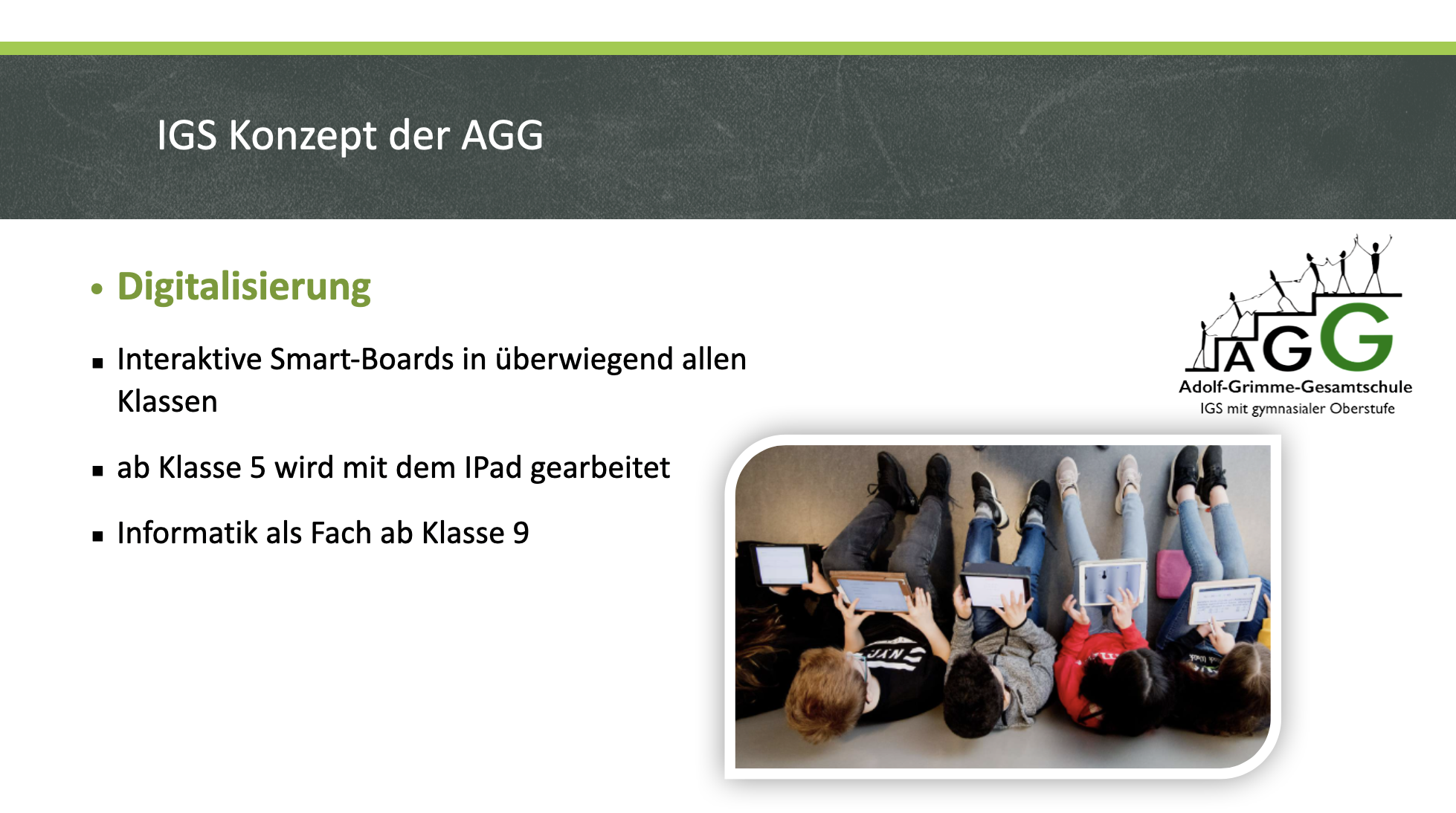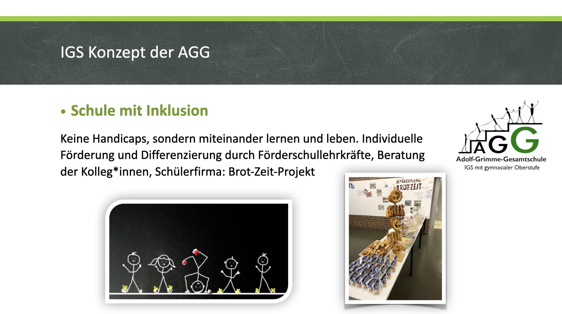 An der Adolf-Grimme-Gesamtschule werden alle Schülerinnen und Schüler (ich bin mir nicht mehr sicher, auf welches Format wir uns geeeinigt haben) in der Sekundarstufe I von Klasse 5 bis 10 gemeinsam im Klassenverband unterrichtet. Dort spielt die innere Differenzierung auch mit Lehrertandems eine besondere Rolle. Jede Schülerin und jeder Schüler wird auf seinem Niveau gefördert und gefordert. Ab Klasse 7 kommen Wahlpflichtkurse hinzu.