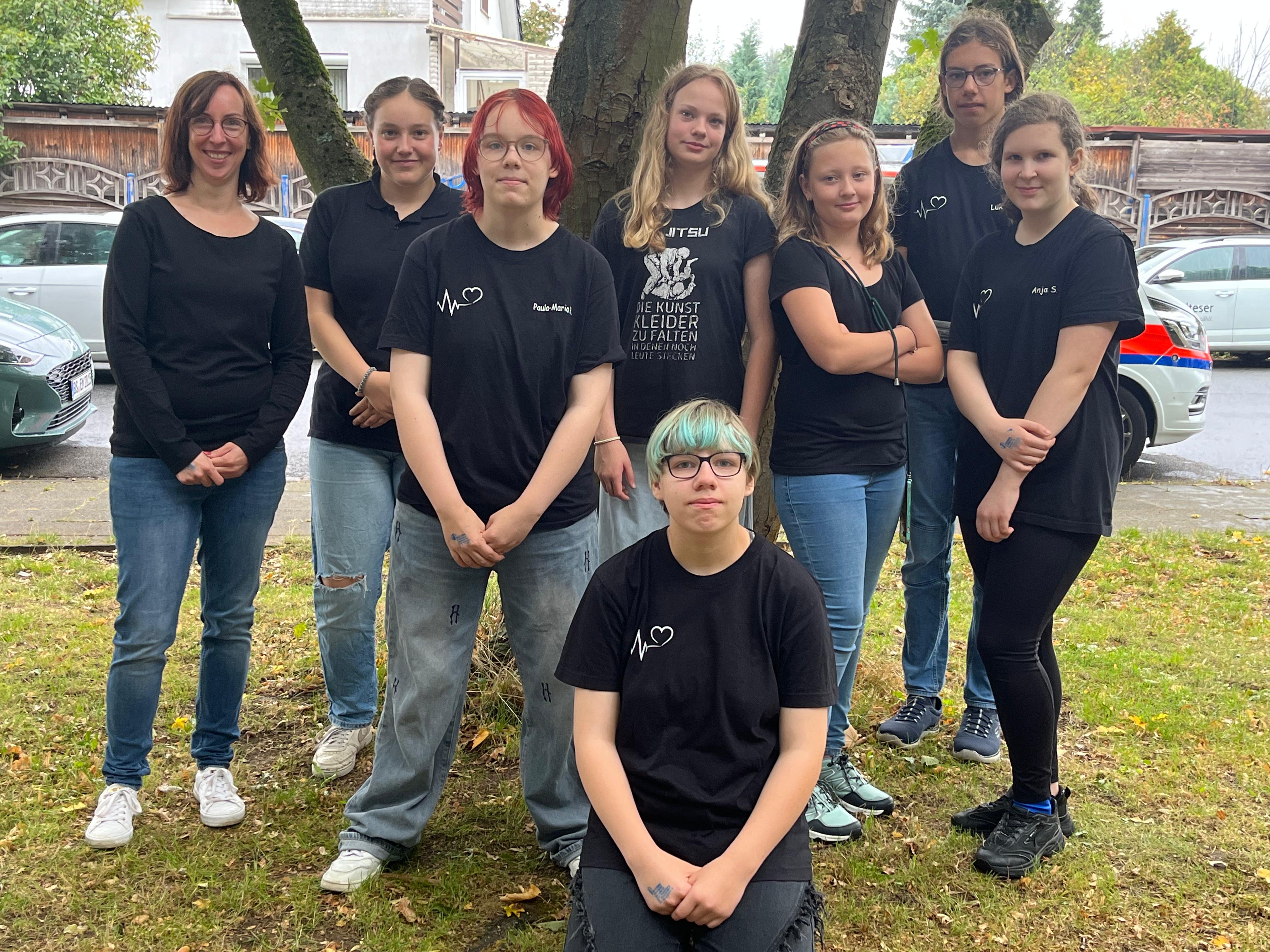 wir sind ein Team von 10 Schulsanitäterinnen und -sanitätern, die unter der Leitung von Frau Lipka jeden Tag in Notsituationen für unsere Mitschüler/innen da sind, indem wir beispielsweise ihnen Verbände anlegen, Pflaster aufkleben oder sie bei Übelkeit und Unwohlsein betreuen.