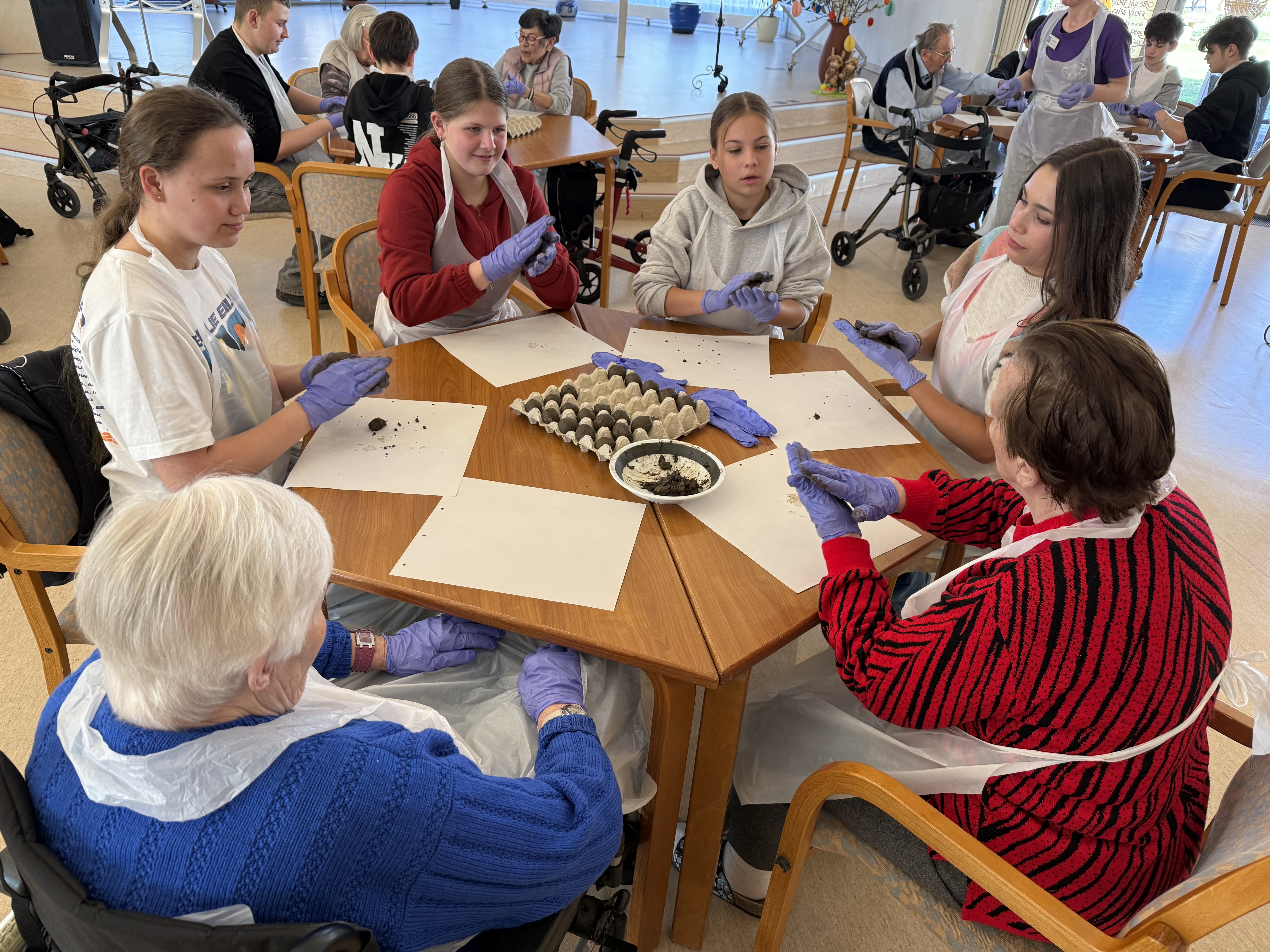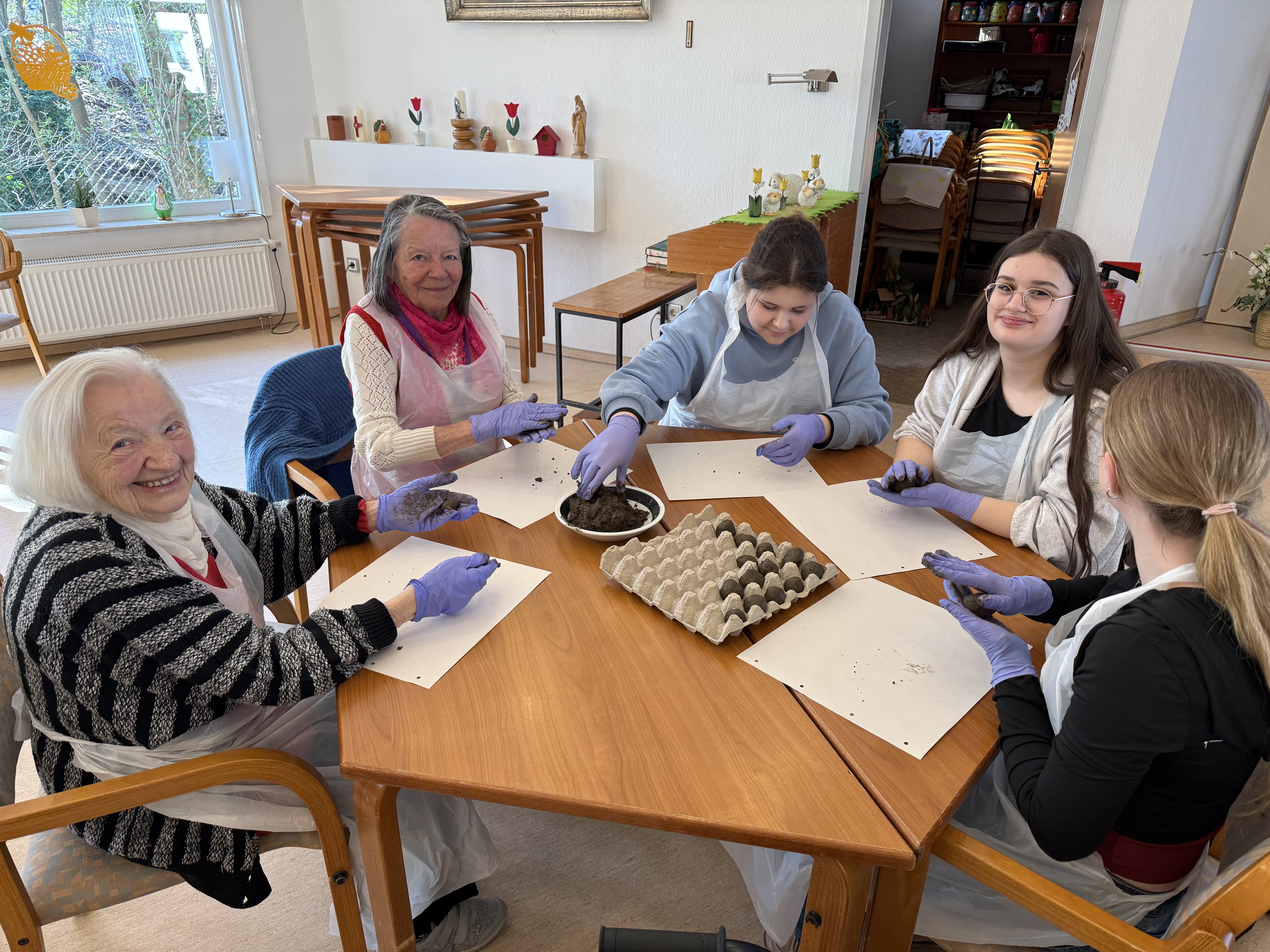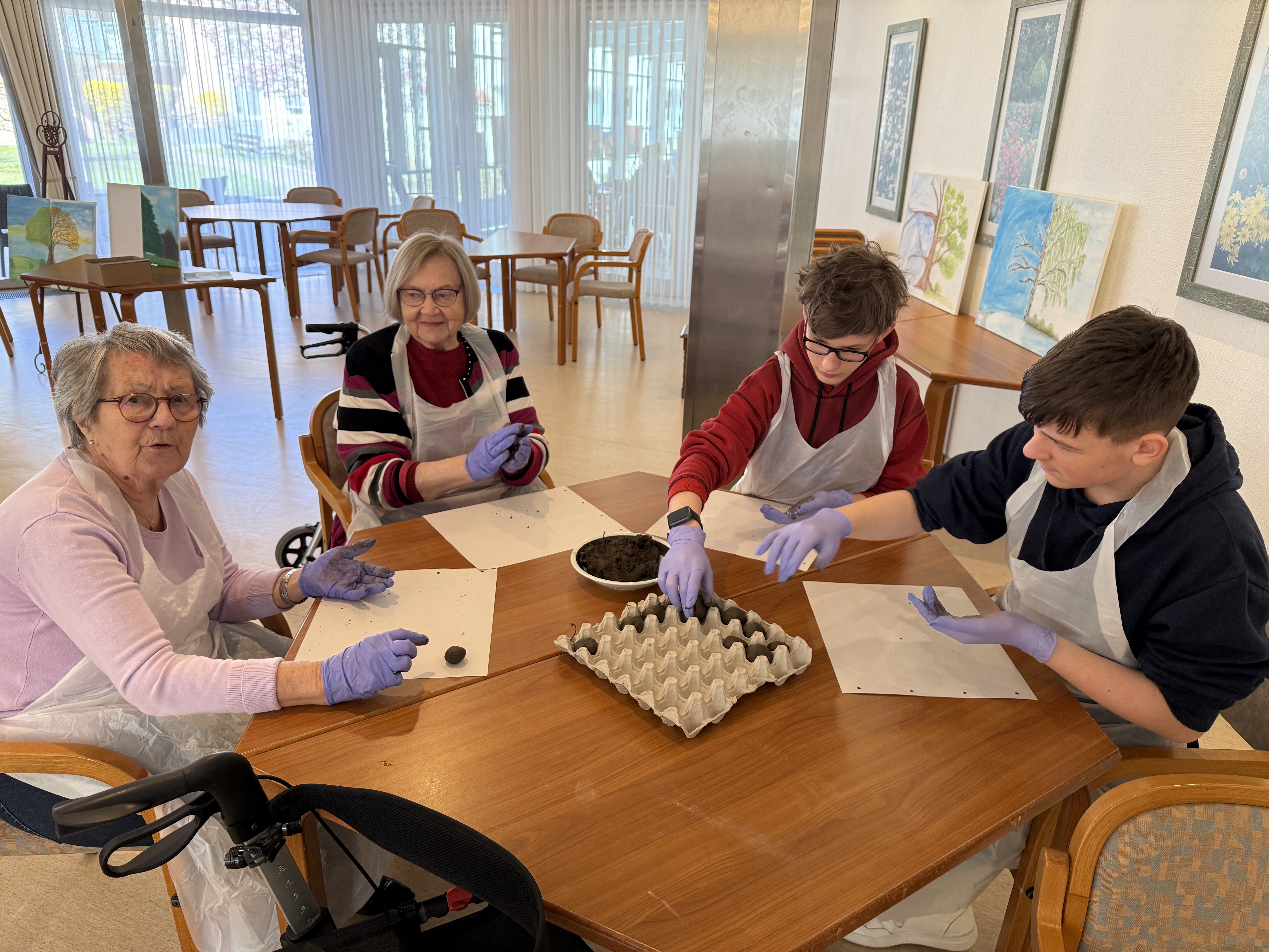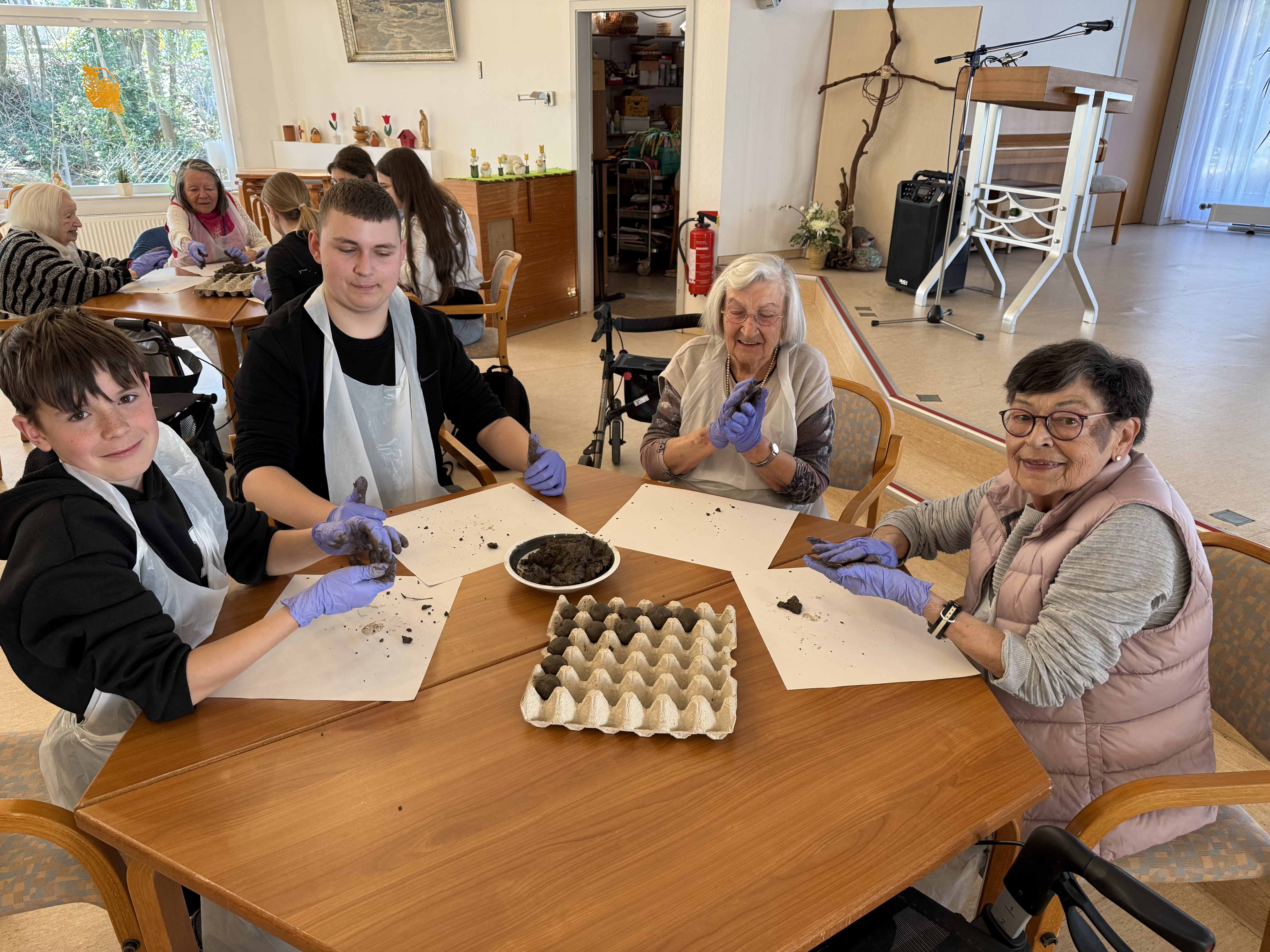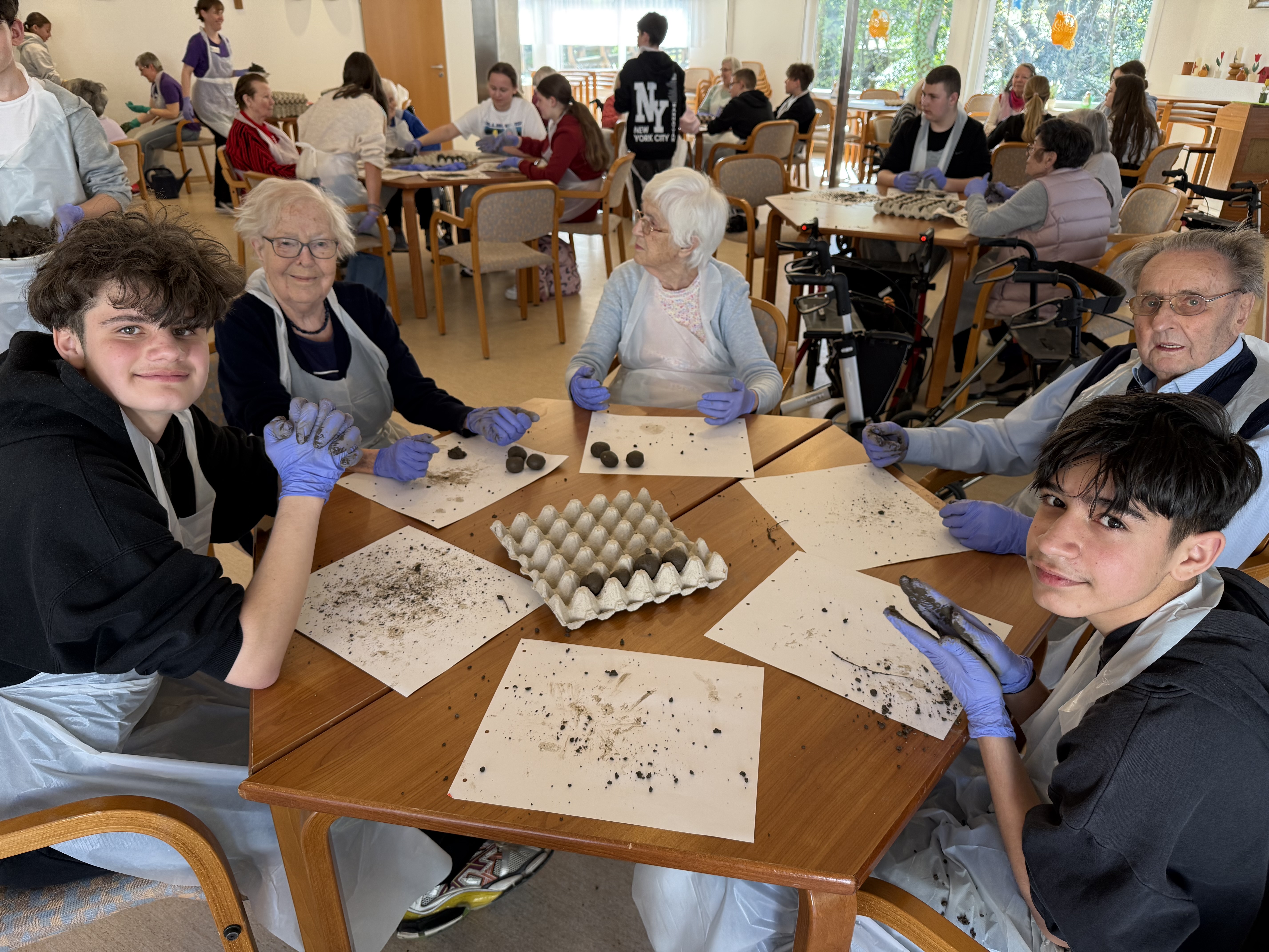 Schüler*innen der Klasse 7a haben gemeinsam mit den Bewohner*innen des Seniorenheims Abendfrieden „Samenbomben“ hergestellt.